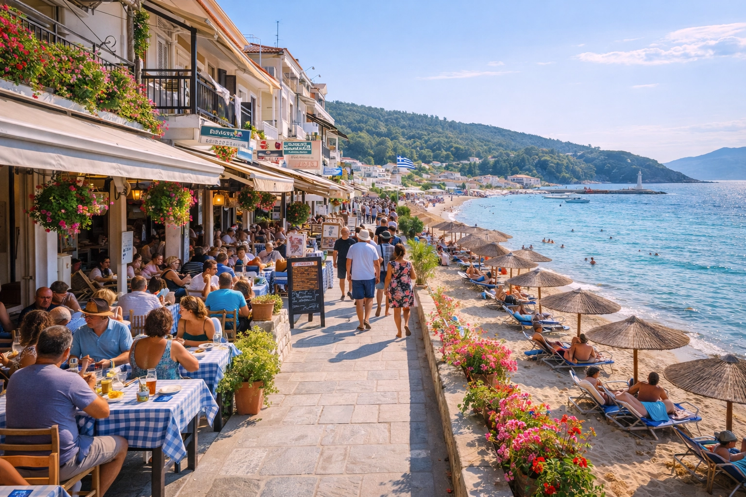 Abends ist es lebendiger (Promenade, Restaurants, Musik), insgesamt bleibt der Ort aber angenehm entspannt und familienfreundlich. Wenn du nach dem Strand gern bummeln und am Meer essen gehst, passt Limenaria sehr gut.